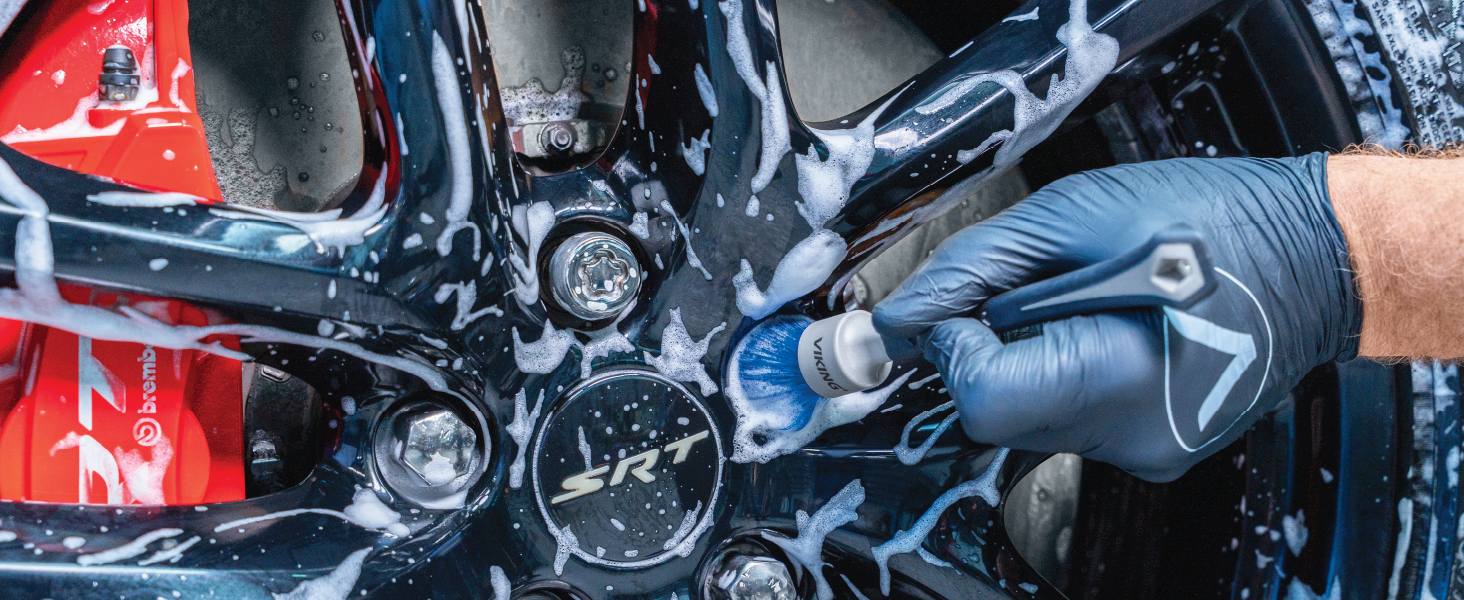 The VIKING Lug Nut Brush has long and soft bristles which easily conform into recessed areas to clean lug nuts, rims, wheels, and more.