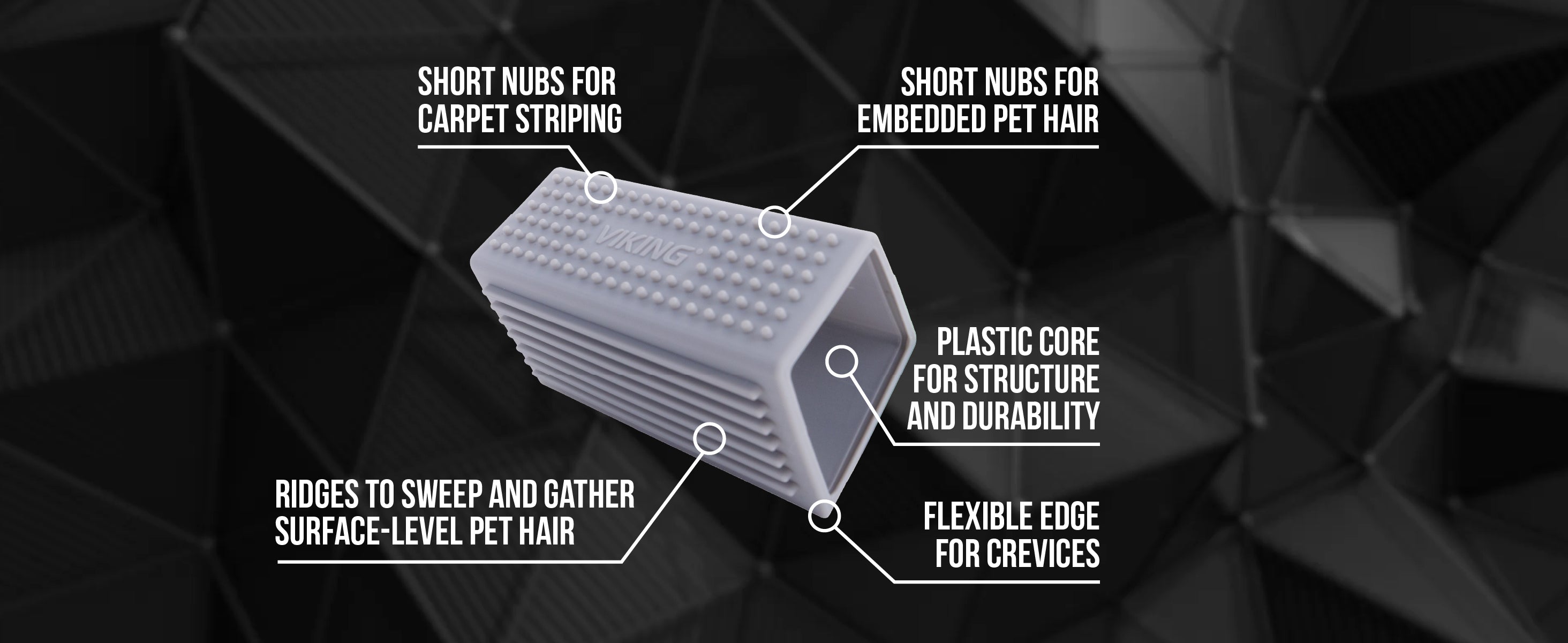 Pet hair can be stubborn, but the Viking Pet Hair Remover makes cleanup simple. Its ergonomic design pairs a grippy silicone shell with a rigid core for control. Two textures, nubs and ridges, help tackle light to heavy buildup. Sweep horizontally to lift hair, then vertically for a crisp, striped finish. The tapered rubber edge reaches into corners and tight spots where other tools cannot – giving your interior a thorough clean.