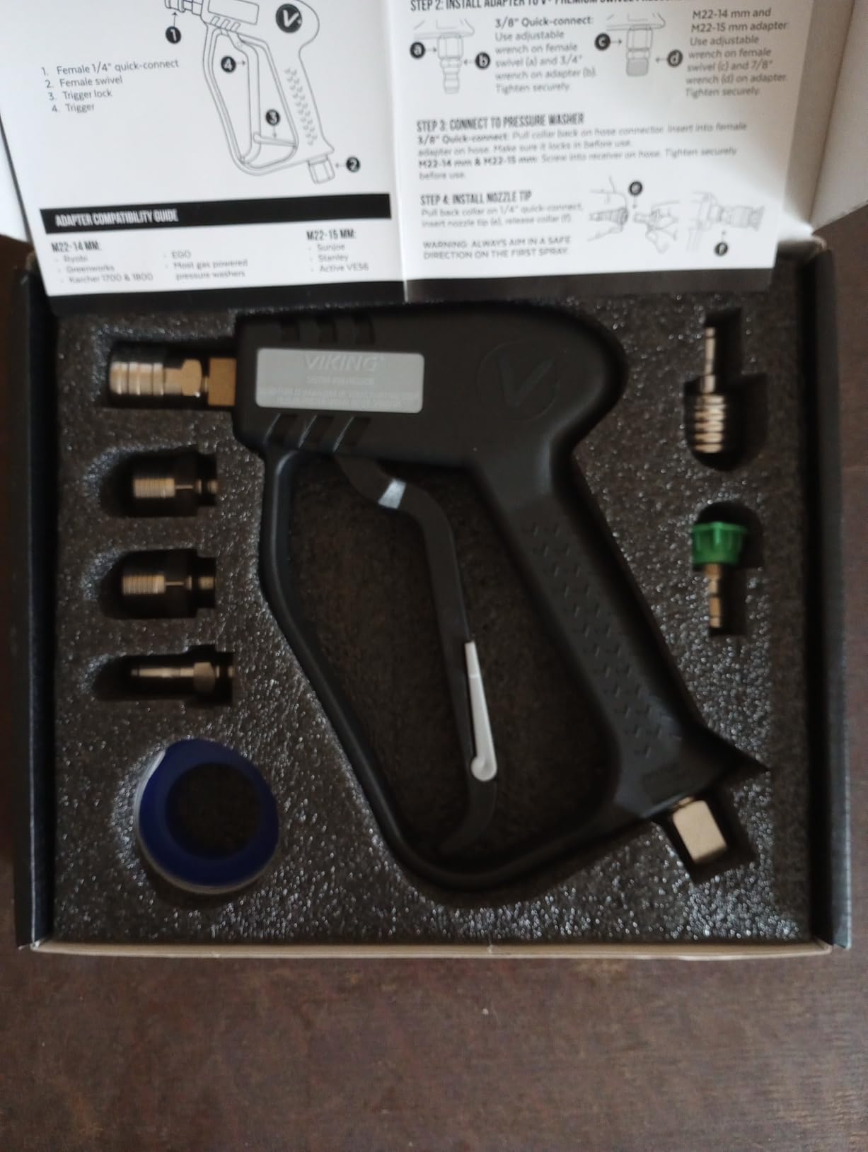 Compact and satisfying to use, this small-body pressure washer gun delivers pro-level results with total control. The 360° swivel inlet keeps your hose smooth and tangle-free, while the ergonomic grip helps reduce fatigue. The ¼” quick connect plus included adapters and nozzles make setup fast and effortless. Built with premium brass internals and stainless connectors, it’s rated up to 4000 PSI and sealed with leak-resistant NPT fittings that stay secure under pressure.