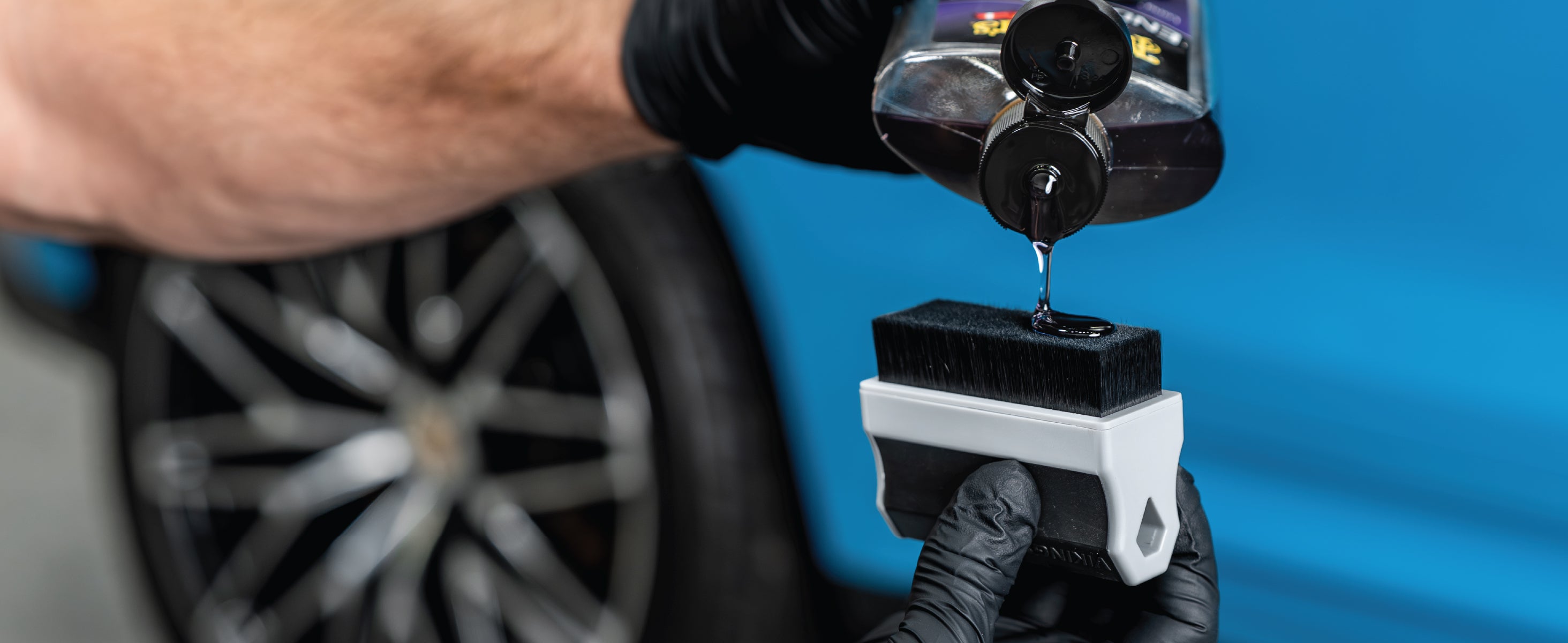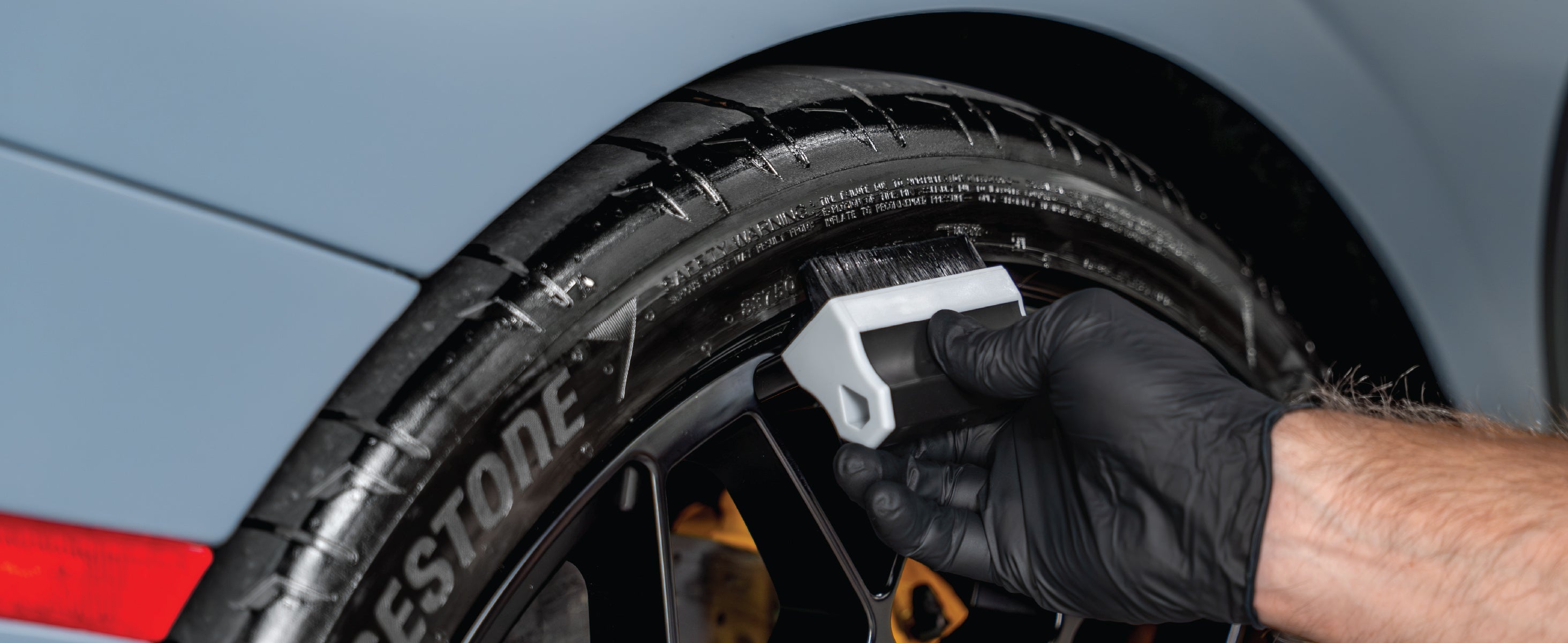 Experience how the V+ Tire Shine Applicator Brush makes applying tire shine fast, clean, and effortless. This ultra-soft applicator brush delivers smooth, even coverage—gliding over lettering, grooves, and raised designs with ease. The compact, ergonomic shape provides excellent control whether working on standard or low-profile tires. This patent-pending brush and storage stand keep your detailing setup organized and ready for the next shine.