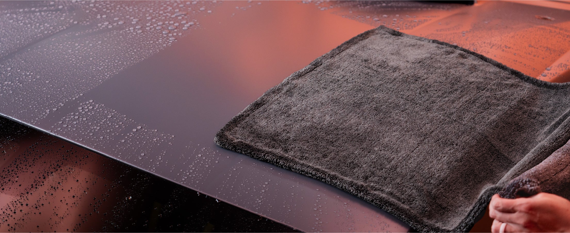 Watch as the V+ Twisted Loop Drying Towel quickly absorbs water in a single swipe. The double layer, 1200 GSM microfiber quickly transports water up from the car's surface, for a faster, more efficient drying experience.